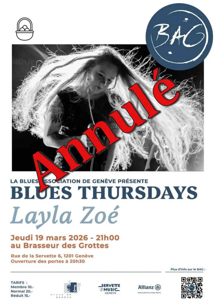 La chanteuse canadienne Layla Zoe qui devait se produire au BAG le 19 mars 2026 a malheureusement, comme en 2024, annulé sa tournée pour des raisons médicales. Nous lui souhaitons le meilleur pour sa santé.